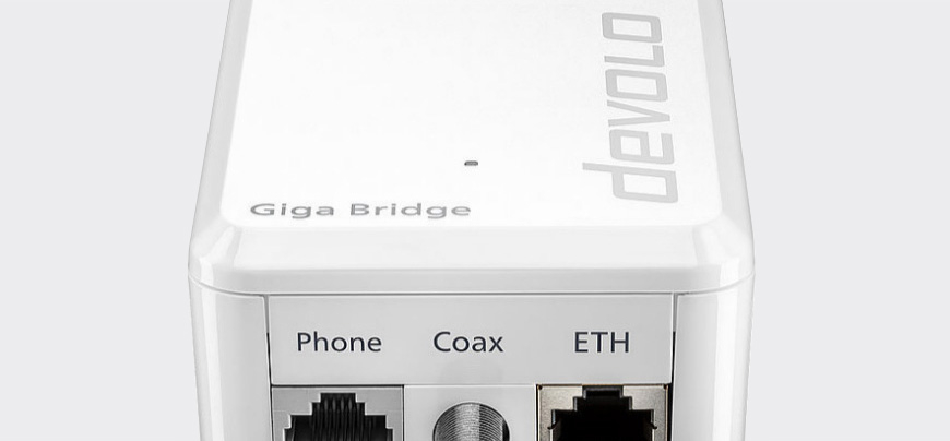 Le Giga Bridge de devolo utilise la ligne coaxiale (TV) ou téléphonique existante pour assurer un transfert de données rapide. C’est ainsi que n’importe quelle prise coaxiale ou téléphonique de la maison offre une vitesse maximale. Idéal pour l’alimentation directe et filaire de points d’accès WiFi éloignés dans la maison.